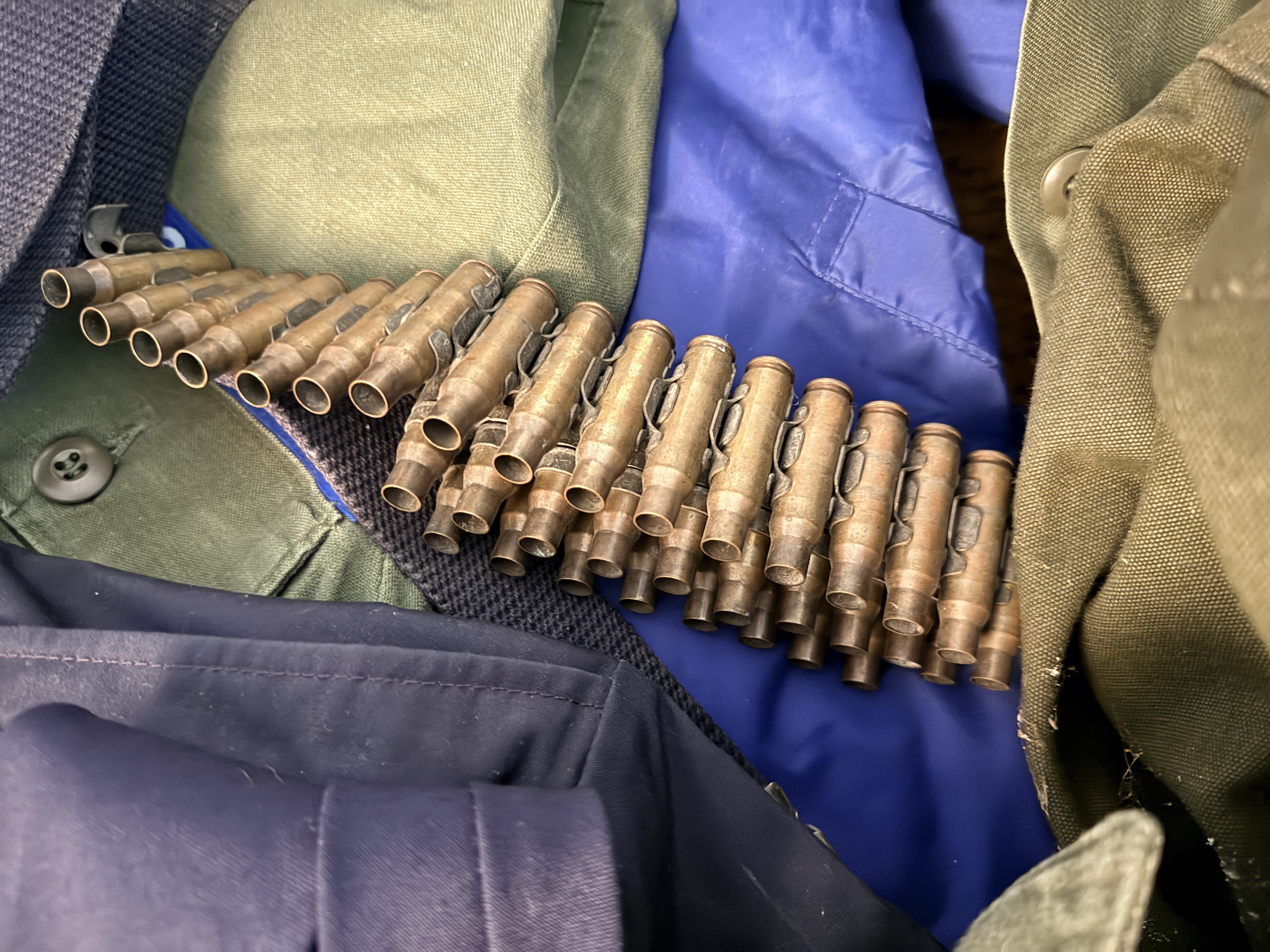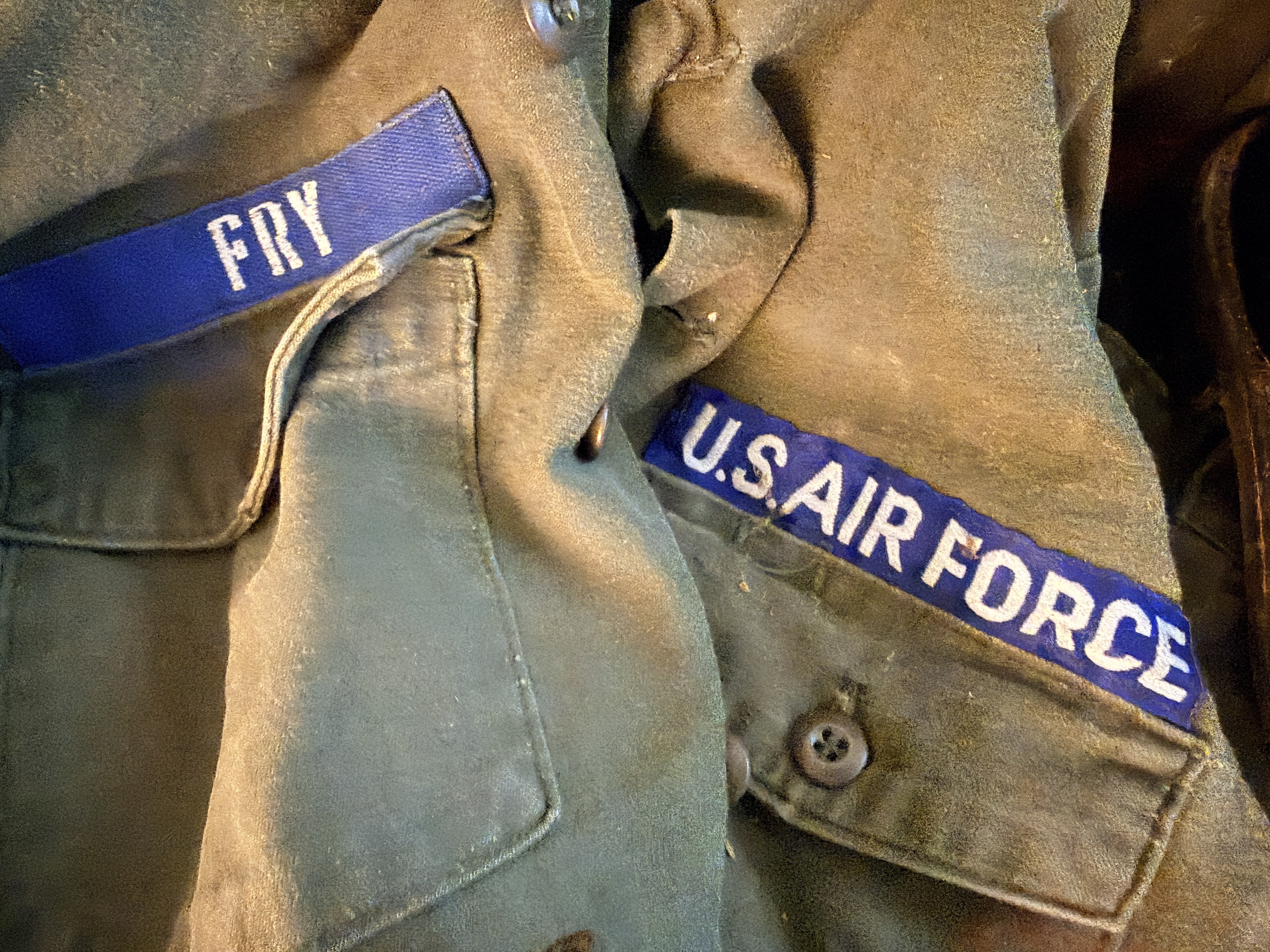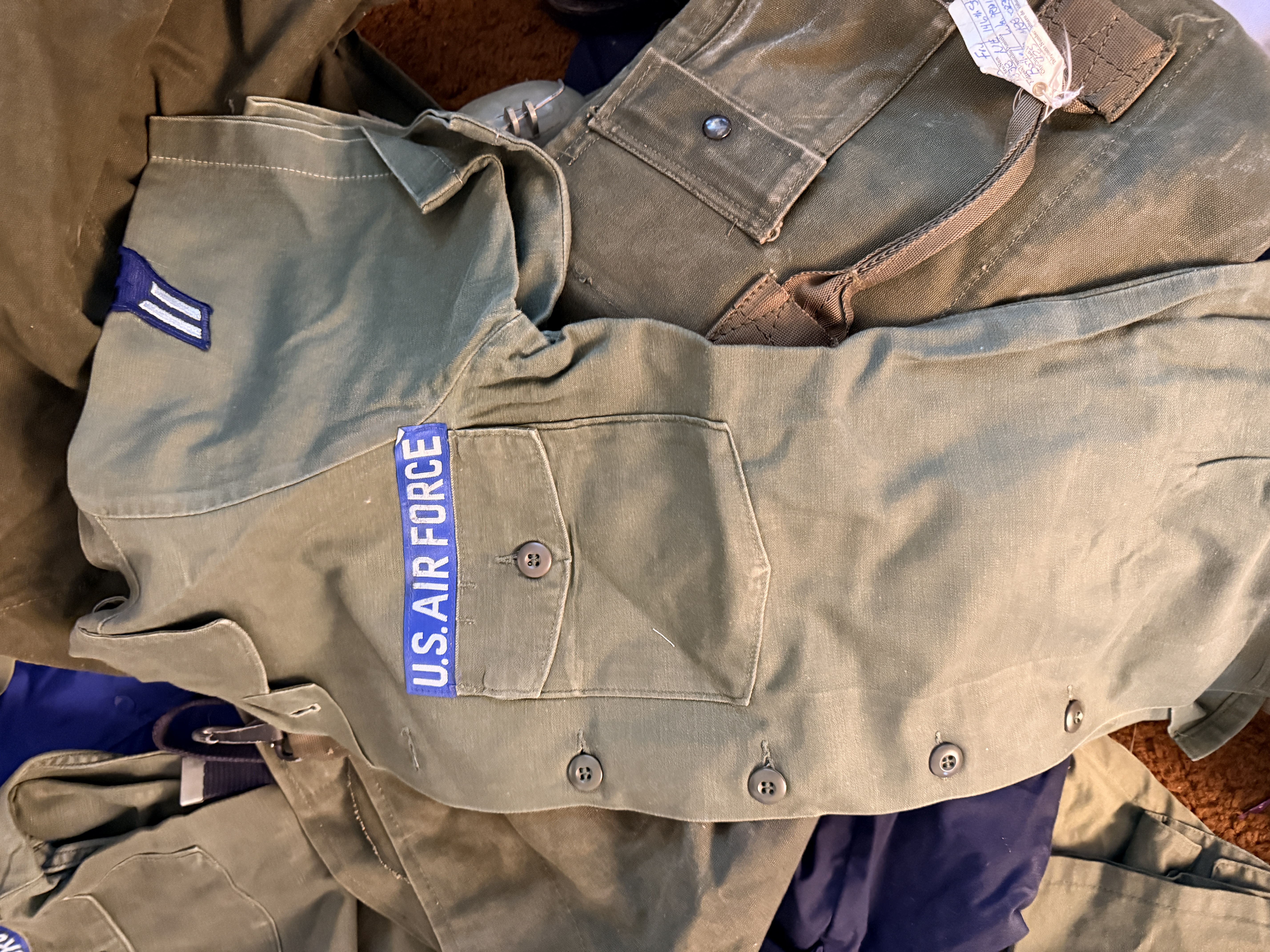 This collection of United States Air Force (USAF) apparel and field gear dates from the Vietnam War through the mid-1970s, primarily attributed to a service member named Fry. The grouping includes an OG-107 M-1965 field jacket featuring a button-in cold weather liner with a visible label from Winfield Mfg. Co., Inc., size Medium (8415-00-782-2889). The jacket is adorned with blue and white embroidered U.S. Air Force and Fry name tapes, alongside a Strategic Air Command (SAC) pocket patch. Multiple OG-107 cotton sateen utility shirts are included, featuring First Lieutenant rank insignia and additional SAC patches. The collection further contains a khaki short-sleeve shirt with a Supreme Headquarters Allied Powers Europe (SHAPE) patch, a dark blue utility shirt with enlisted rank insignia, and a pair of black leather dress oxfords. Supplemental equipment consists of an olive drab canvas duffel bag (2 of these) stenciled with the name Donald, a pair of flight line hearing protectors with a padded headband, a blue web belt with a silver-tone buckle, a small khaki canvas pouch, and a belt of inert brass shell casings joined by metal links.