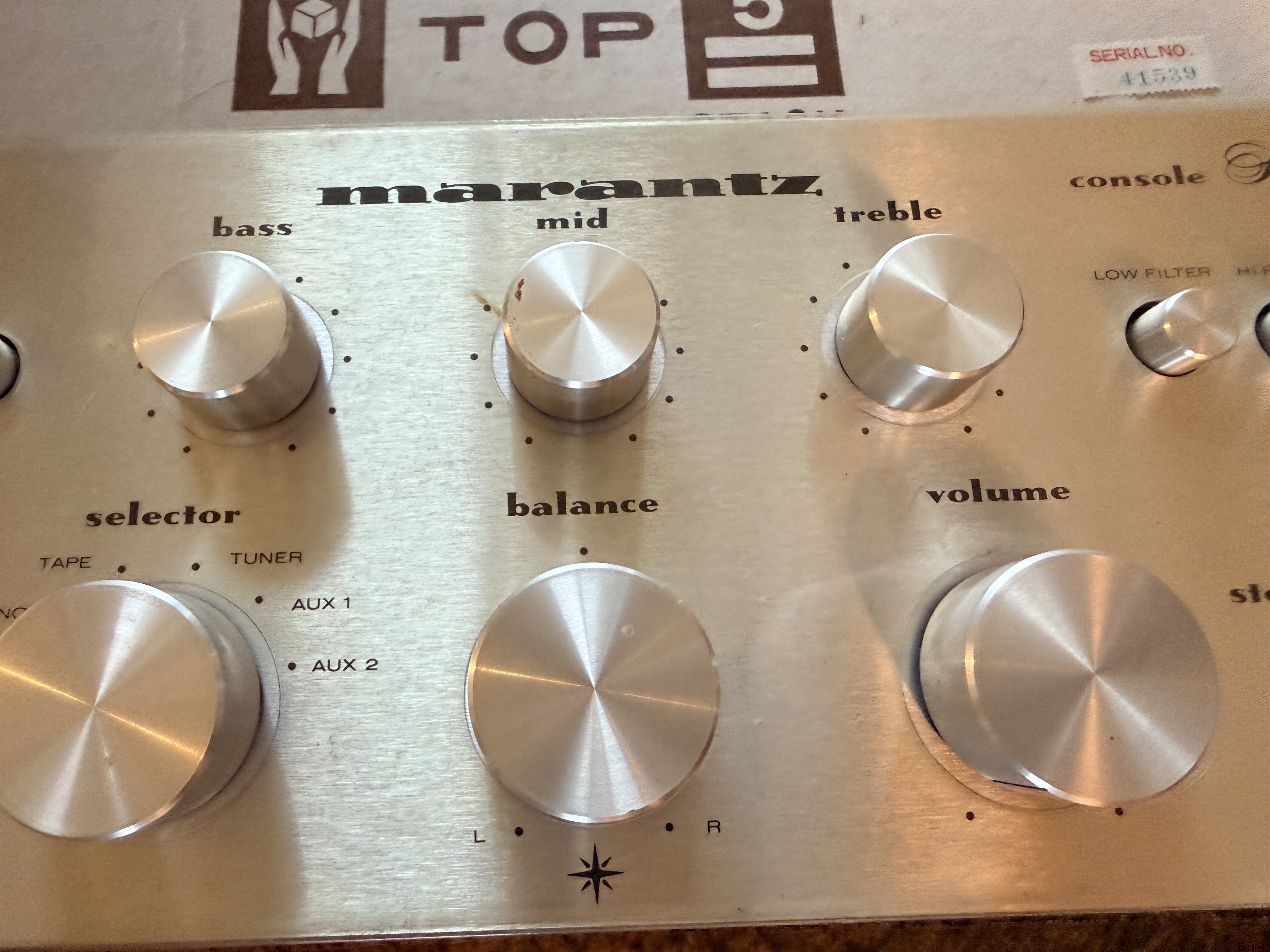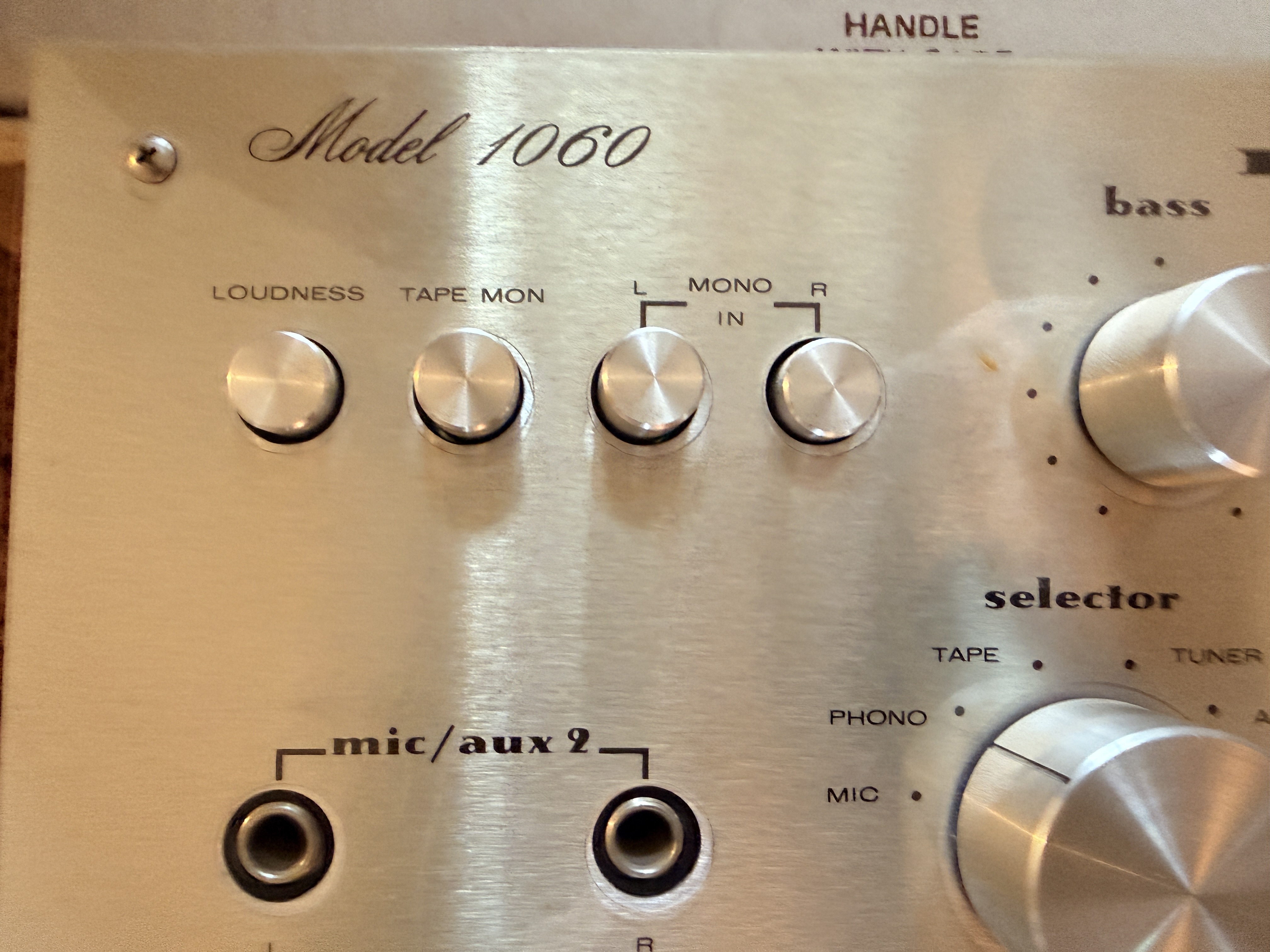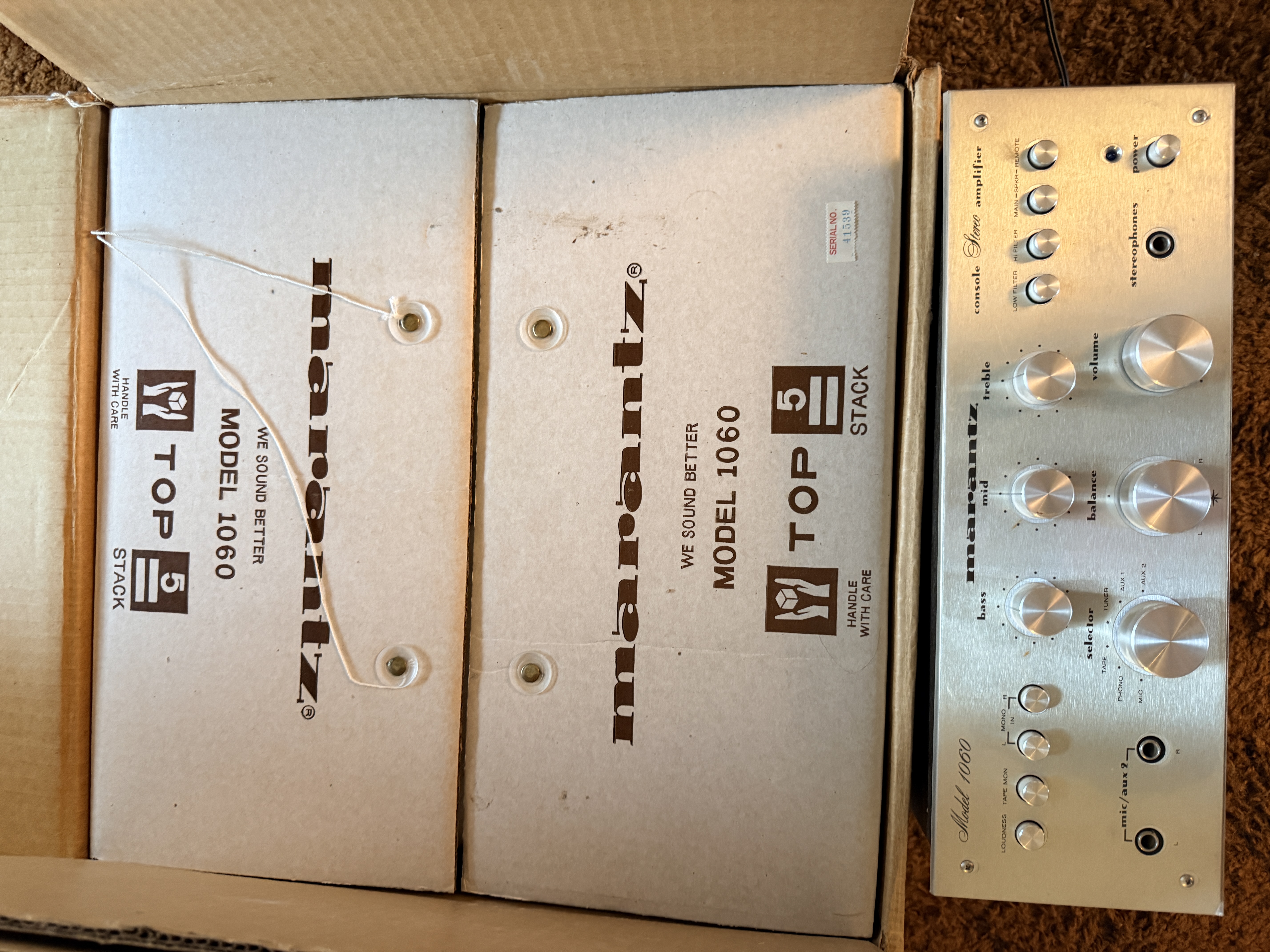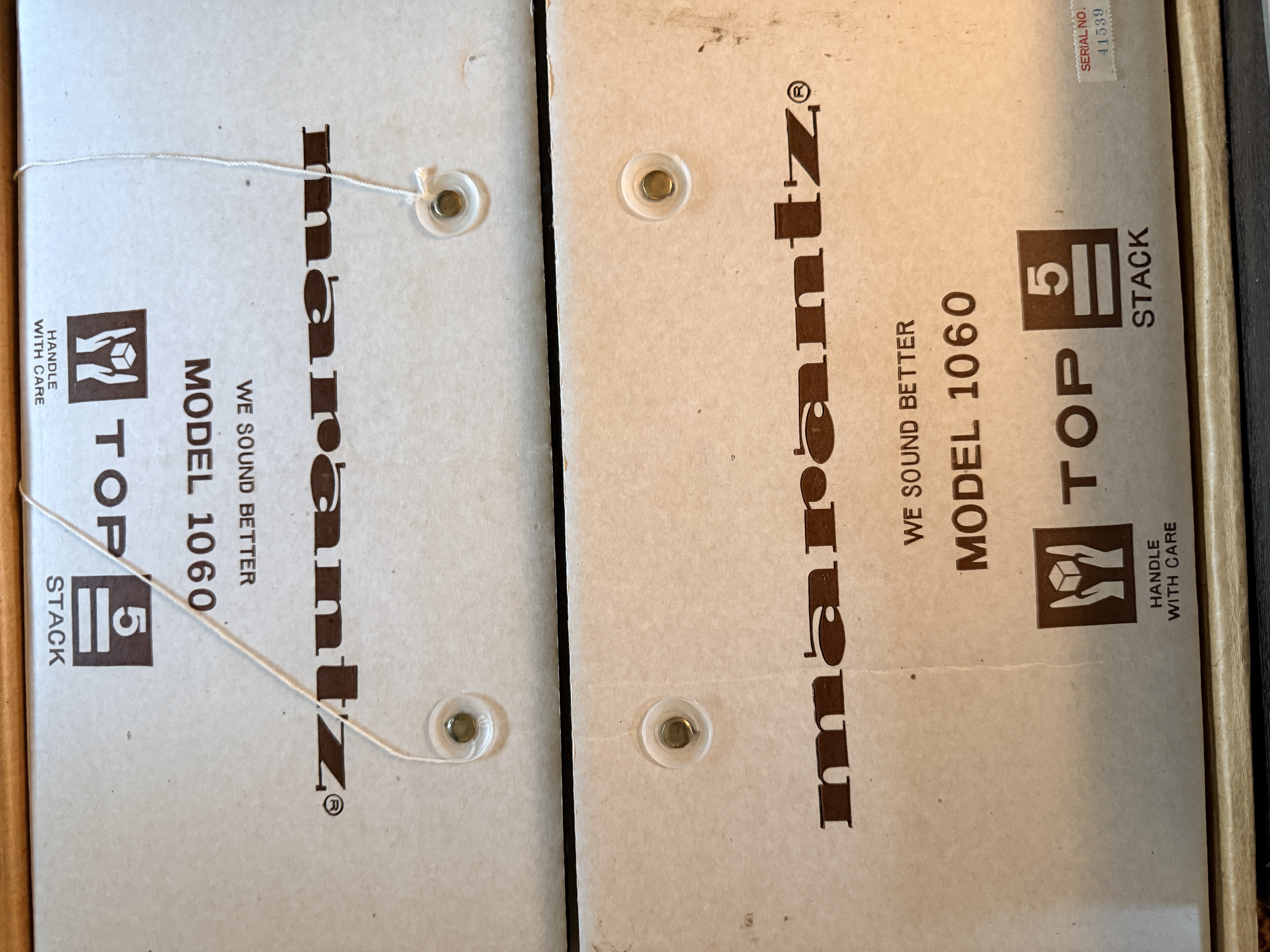 A Marantz Model 1060 solid-state integrated console stereo amplifier. The unit features a brushed aluminum faceplate with machined aluminum control knobs and a wood-grain veneer cabinet. The top of the cabinet includes a slotted metal ventilation panel and a small black label reading SEE MARKING ON BOTTOM. The faceplate is marked Model 1060 in cursive script, marantz in stylized lowercase lettering, and console Stereo amplifier. Control features include three-way tone adjustments for bass, mid, and treble, alongside balance and volume knobs. The input selector provides settings for phono, mic, tape, tuner, aux 1, and aux 2. Push-button controls are present for loudness, tape monitor, mono (L and R), low filter, hi filter, and speaker selection (main and remote). The front panel also contains two mic/aux 2 input jacks and a stereophones output jack. The item is accompanied by its original two-piece cardboard manufacturer box, which features the Marantz logo, the slogan WE SOUND BETTER, and a serrated paper serial number tag printed with 41539.