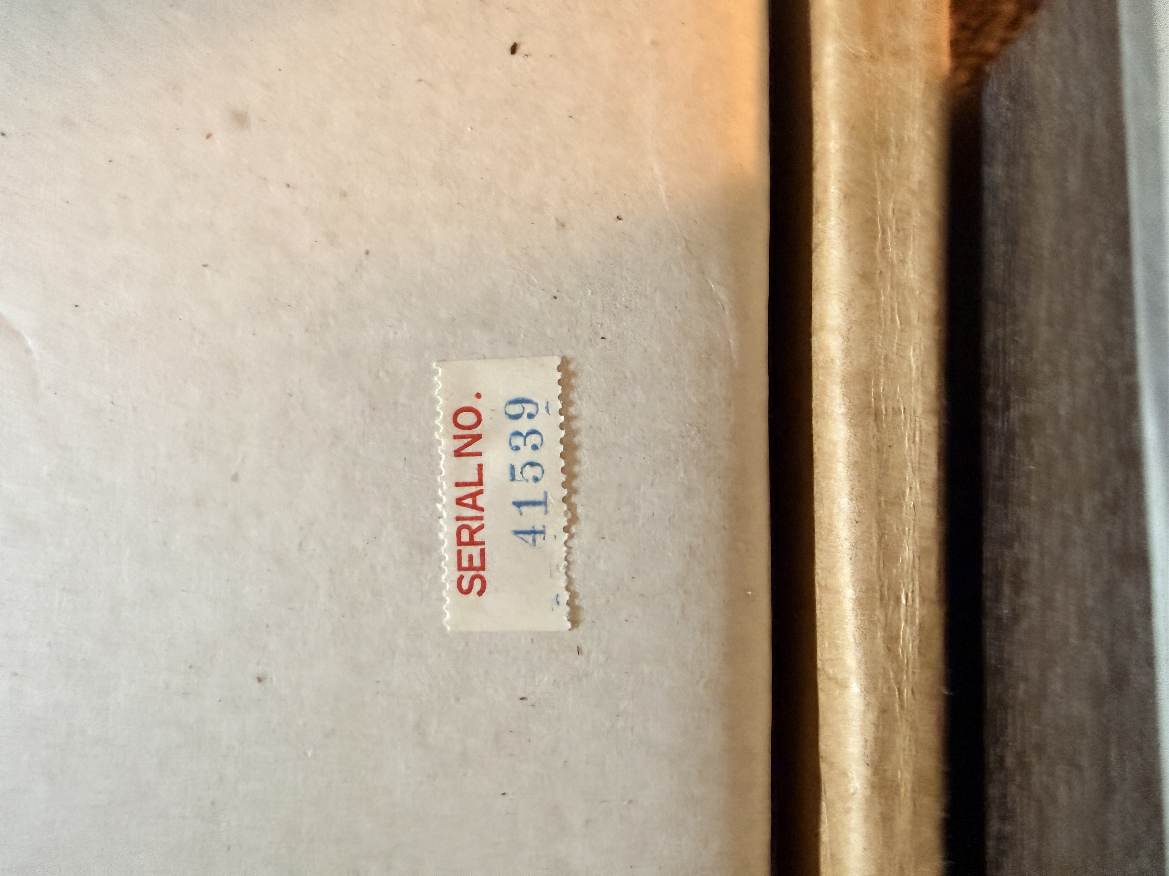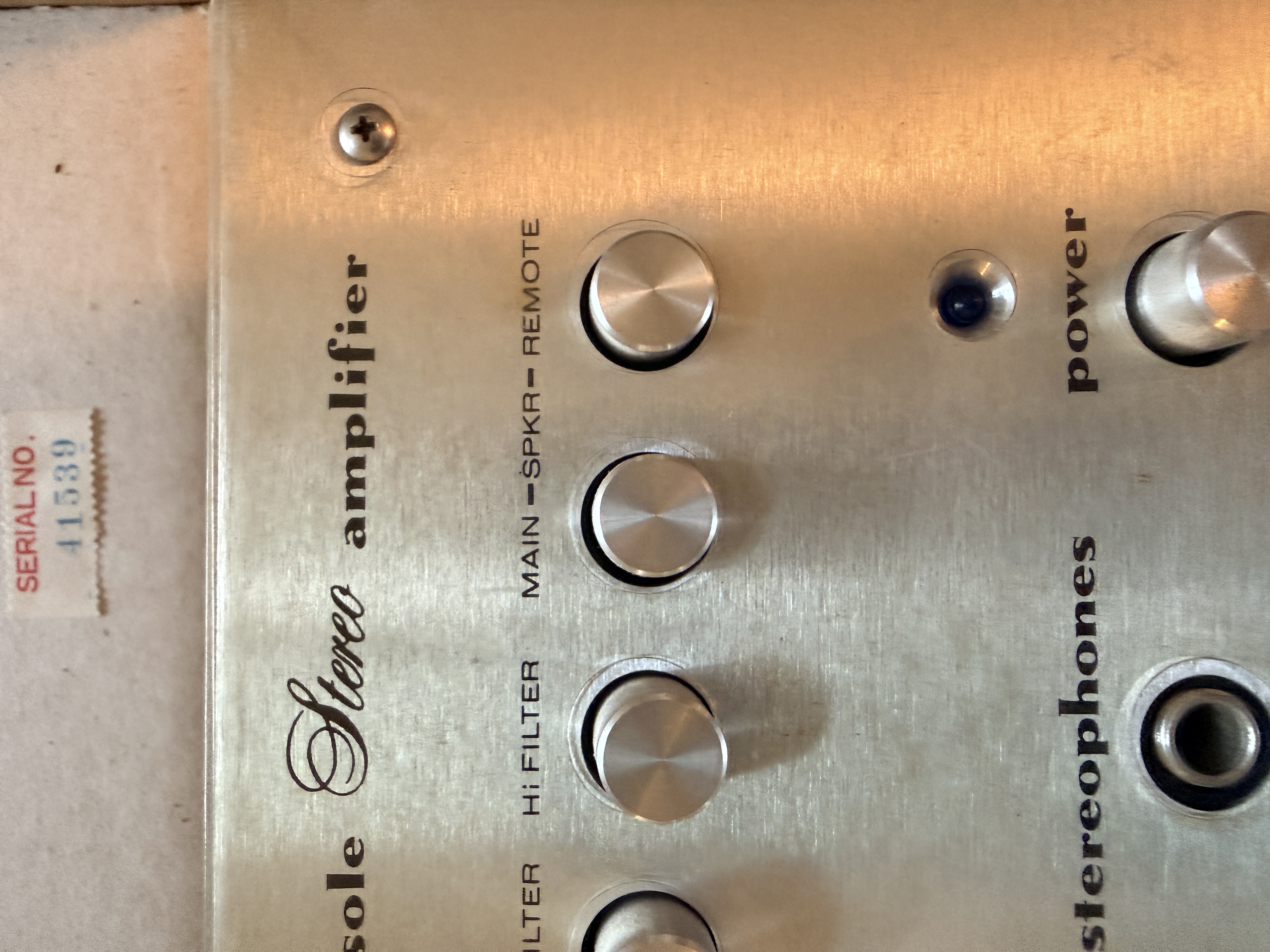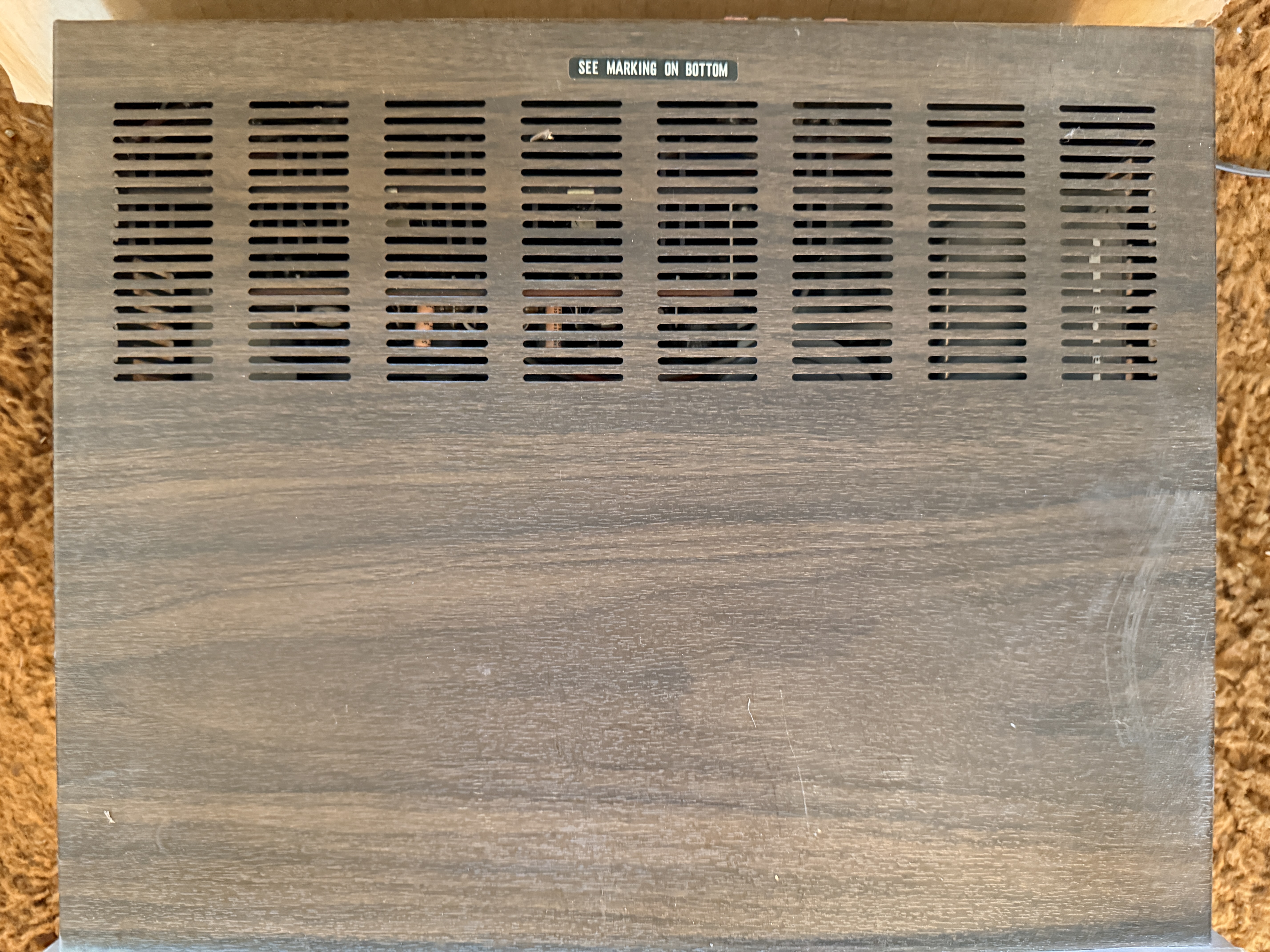 The aluminum faceplate shows minor surface wear and light oxidation consistent with age. The wood-grain cabinet exhibits visible surface scratches, scuffs, and dust accumulation. The original cardboard packaging shows significant wear, including staining, tears, and remnants of adhesive tape. This item is untested for functionality and is sold in as-is condition. At the time of our photos, this was plugged in and being used - it was quite dusty.